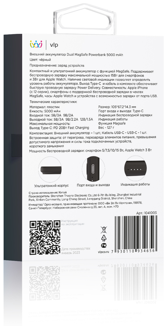 Внешний аккумулятор VLP Dual MagSafe с поддержкой беспроводной зарядки — незаменимый помощник, который позволит одновременно зарядить смартфон и смарт-часы. Устройство поддерживает протоколы быстрой зарядки. Емкость аккумулятора составляет 5 000 мАч, этого достаточно, чтобы полностью зарядить смартфон.